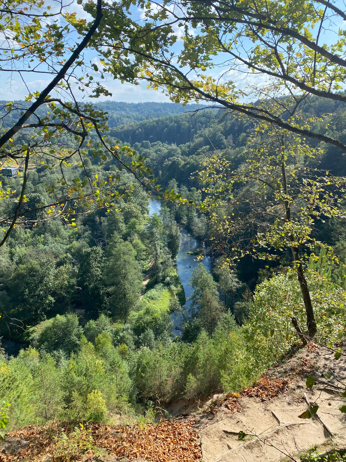 One of the highlights is Belmontas, a former mill turned restaurant and entertainment complex, which overlooks waterfalls and forest views. For more adventure, walk up to the Pūčkorių Atodanga viewpoint. The climb is steep but well worth it, with panoramic views over the entire valley.